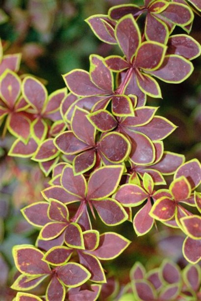 Листя: форма листочків – почергово розташовані, яйцеподібні. Колір - темно-червоні з вузькою жовтою або жовто-зеленої каймою. Червоне поле оточене жовтим «рингом», осіннє забарвлення темно-червоне.