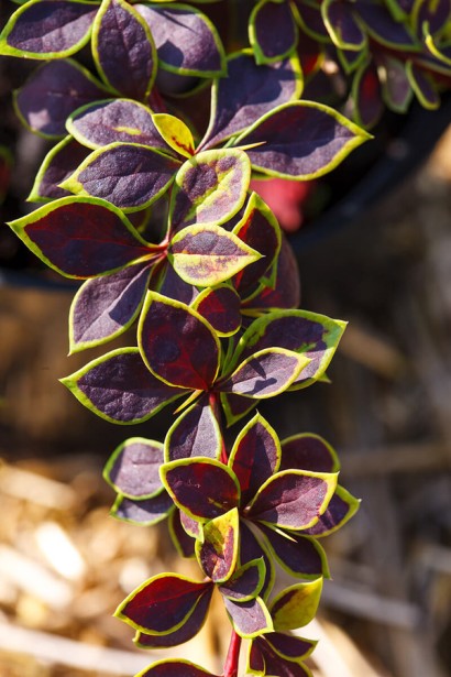 Листя: барбарис Коротіта має темно-червоні з салатовою облямівкою, еліптичні, із загостреною верхівкою листочки.