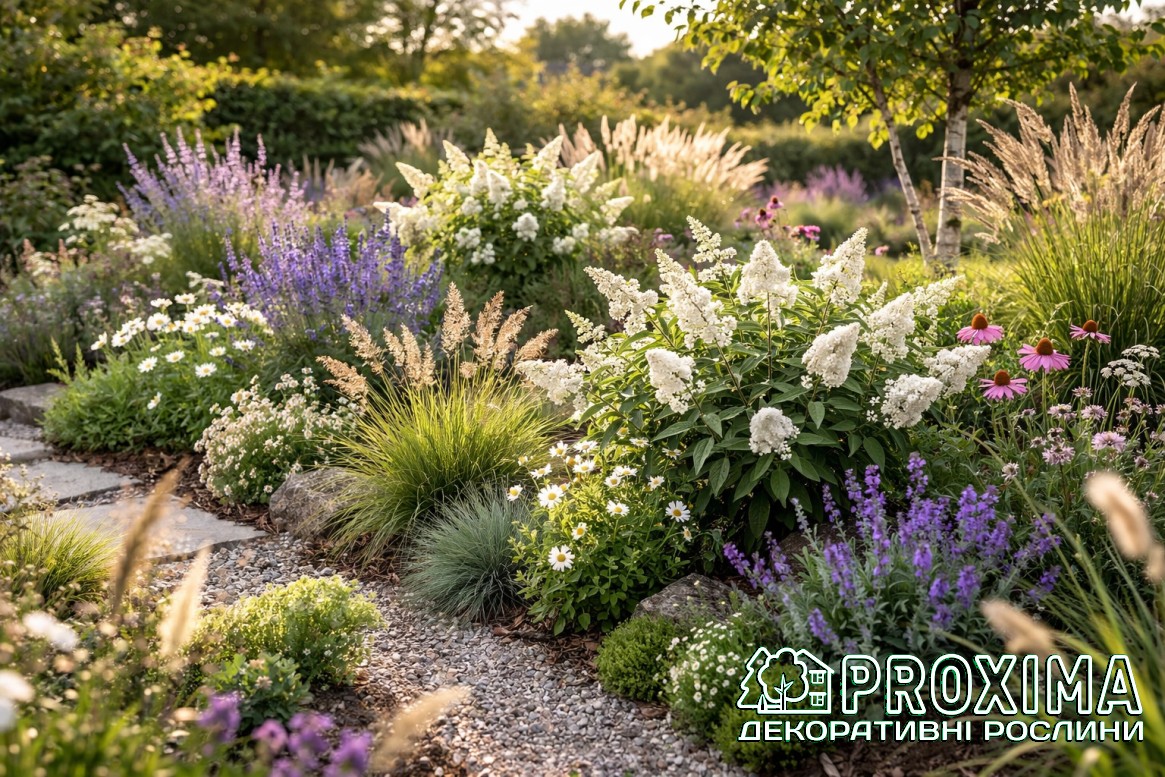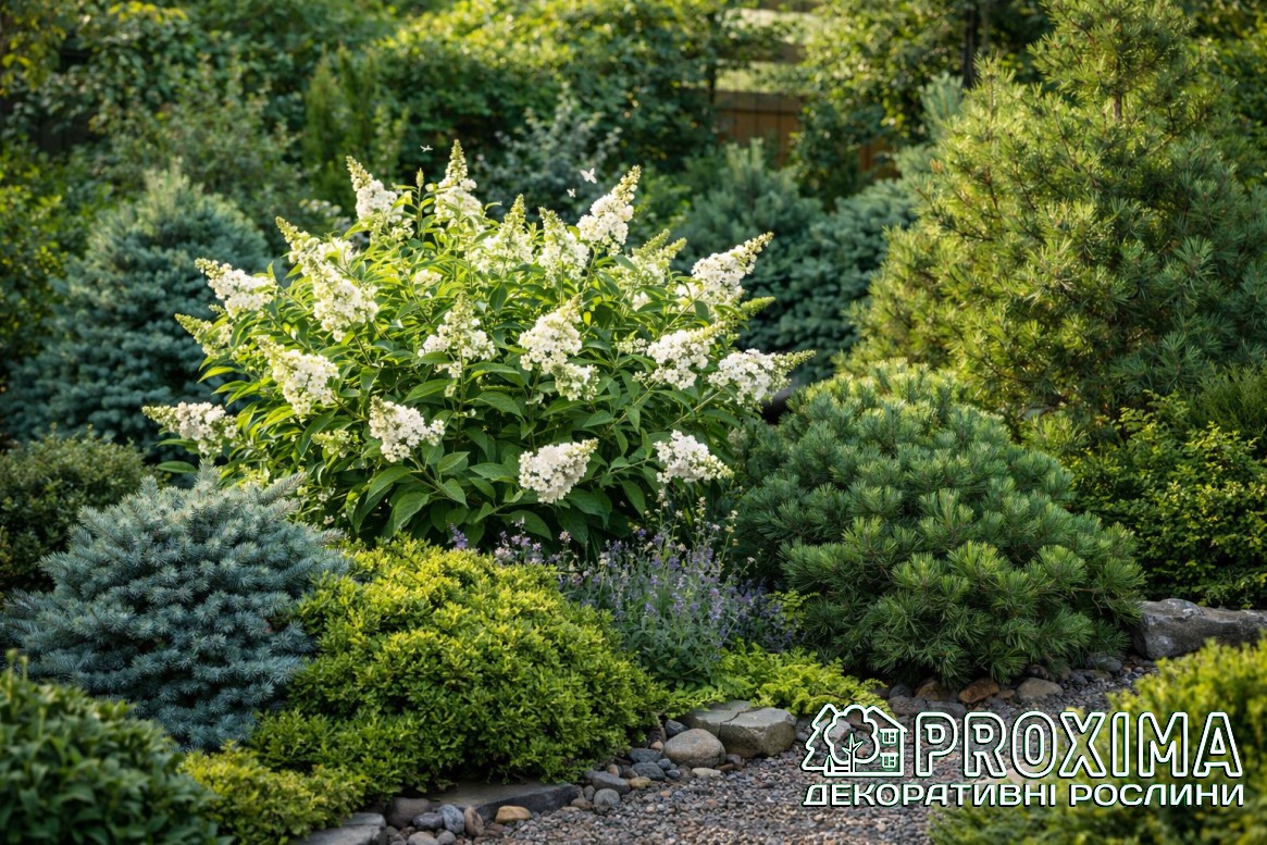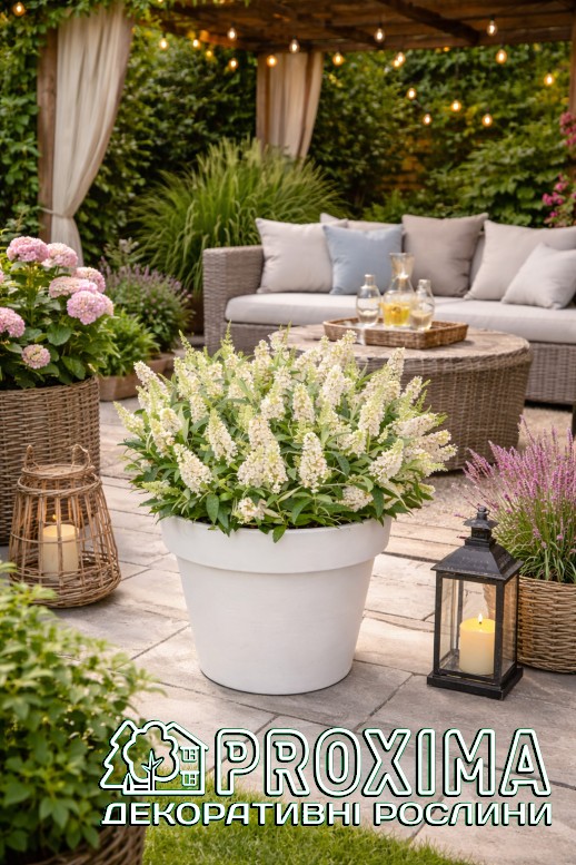 Використання в ландшафтному дизайні: Буддлея Давида Літл Вайт — це легкий білий подих літа в саду. Компактна, охайна, з природною кулястою формою, вона ніби створена для сучасного простору, де кожна рослина має звучати чисто й виразно. Її білосніжні суцвіття спалахують серед зелені м’яким світлом, додаючи композиції свіжості й повітря. Вона не перевантажує — вона підкреслює. У невеликому саду стає витонченим акцентом, на терасі в контейнері — живою прикрасою біля входу, а в міксбордері — спокійною нотою, що поєднує кольори в гармонійний ансамбль. Як різновид Buddleja davidii, ця буддлея притягує до себе метеликів і бджіл, наповнюючи простір рухом і життям. Вона доречна в садах природного стилю, у прерійних композиціях із декоративними злаками, у світлих біло-сріблястих квітниках, де цінується текстура й ритм. ‘BC Little White’ не потребує складних формувань — її форма вже довершена природою. Це рослина для тих, хто любить елегантність без зайвого клопоту, легкість без хаосу й довге, щедре цвітіння, яке триває до кінця літа.