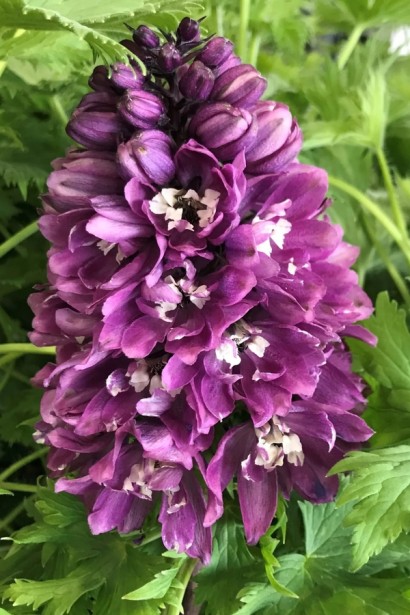 Квіти: Великі, махрові, ніжно-лілово-рожеві з виразною білою серединкою (“white bee”). Зібрані у щільні пірамідальні суцвіття до 30 см завдовжки.