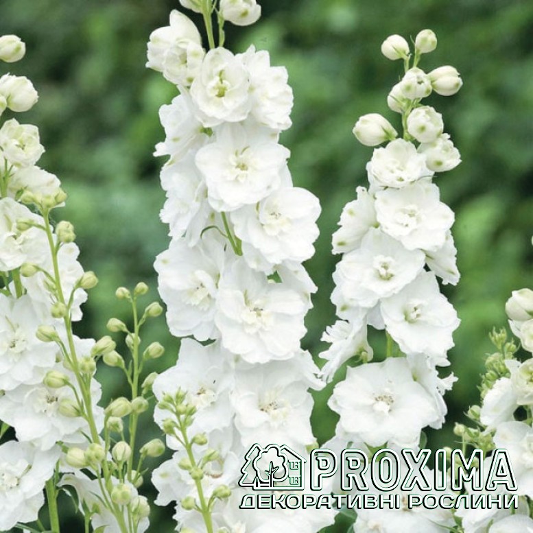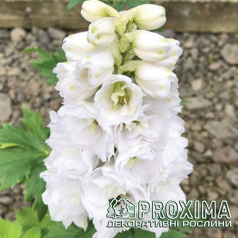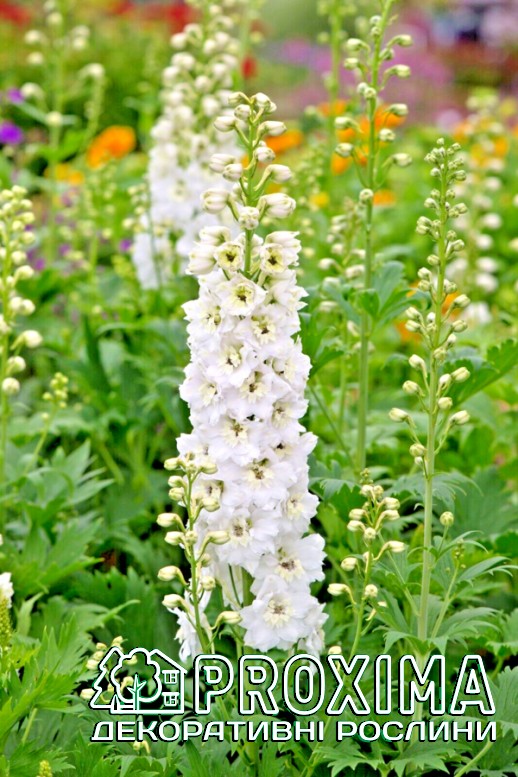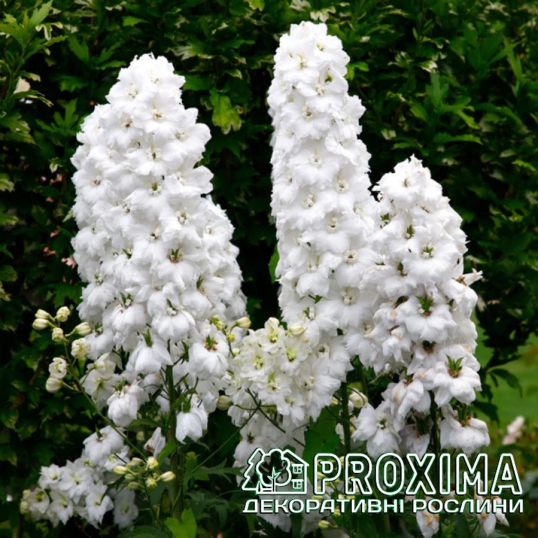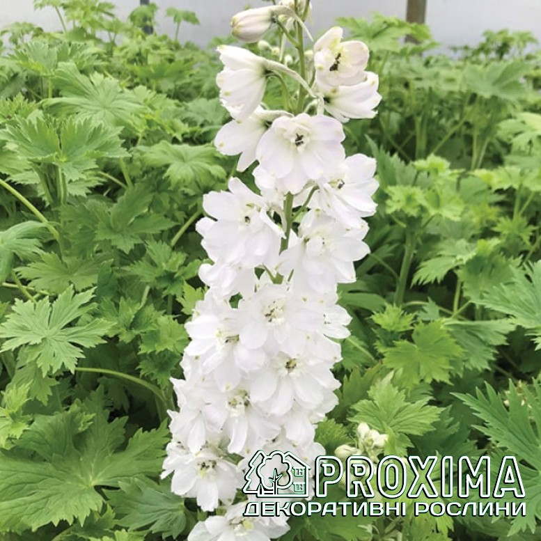 Купити Дельфініум високий `Меджік Фонтейн Пур Вайт` в Києві за низькими цінами можна в розсаднику найбільшої колекції декоративних рослин для українського клімату ПРОКСІМА.