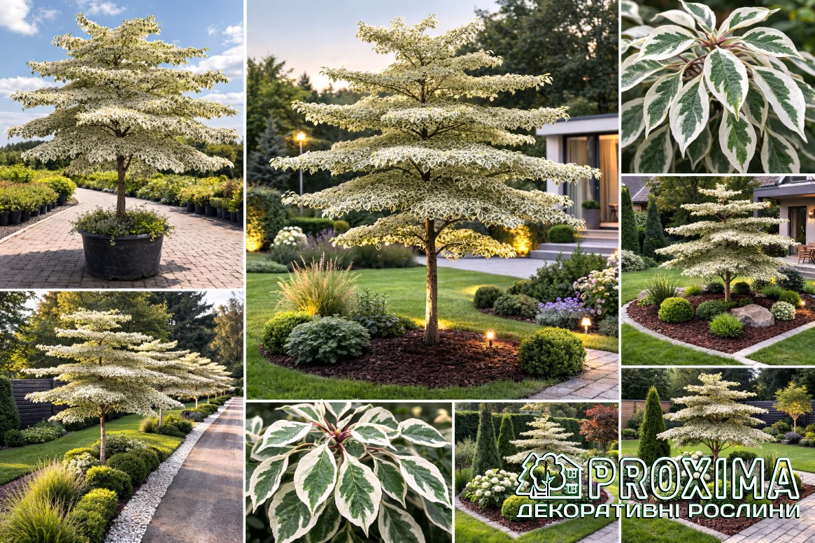 Опис сорту: Дерен спірний Варієгата — це дерево, яке ніби створене архітектором світла. Його гілки розташовані ярусами, горизонтальними «поверхами», формуючи вишукану, майже графічну силуетну структуру. Саме тому вид Cornus controversa часто називають «весільним тортом» або «дерево пагода». Але форма — лише половина магії. Листя сорту ‘Variegata’ прикрашене широкою кремово-білою облямівкою, що ніби підсвічує кожен ярус. У півтіні крона світиться м’яким сяйвом, а на сонці створює виразний контраст зелені та світла. Навесні дерево вкривається ніжними білими суцвіттями, влітку — декоративними темними ягодами, а восени листя набуває теплих рожево-пурпурових відтінків.