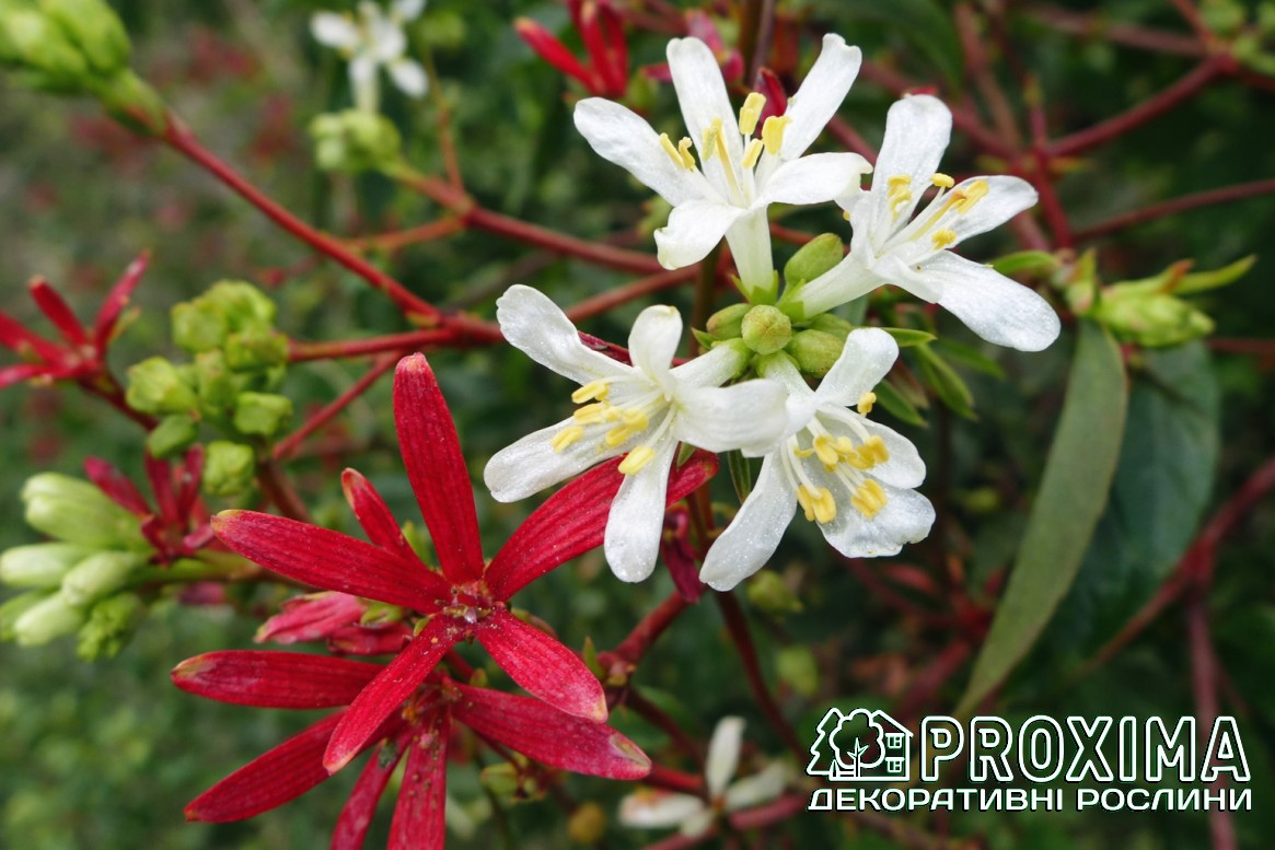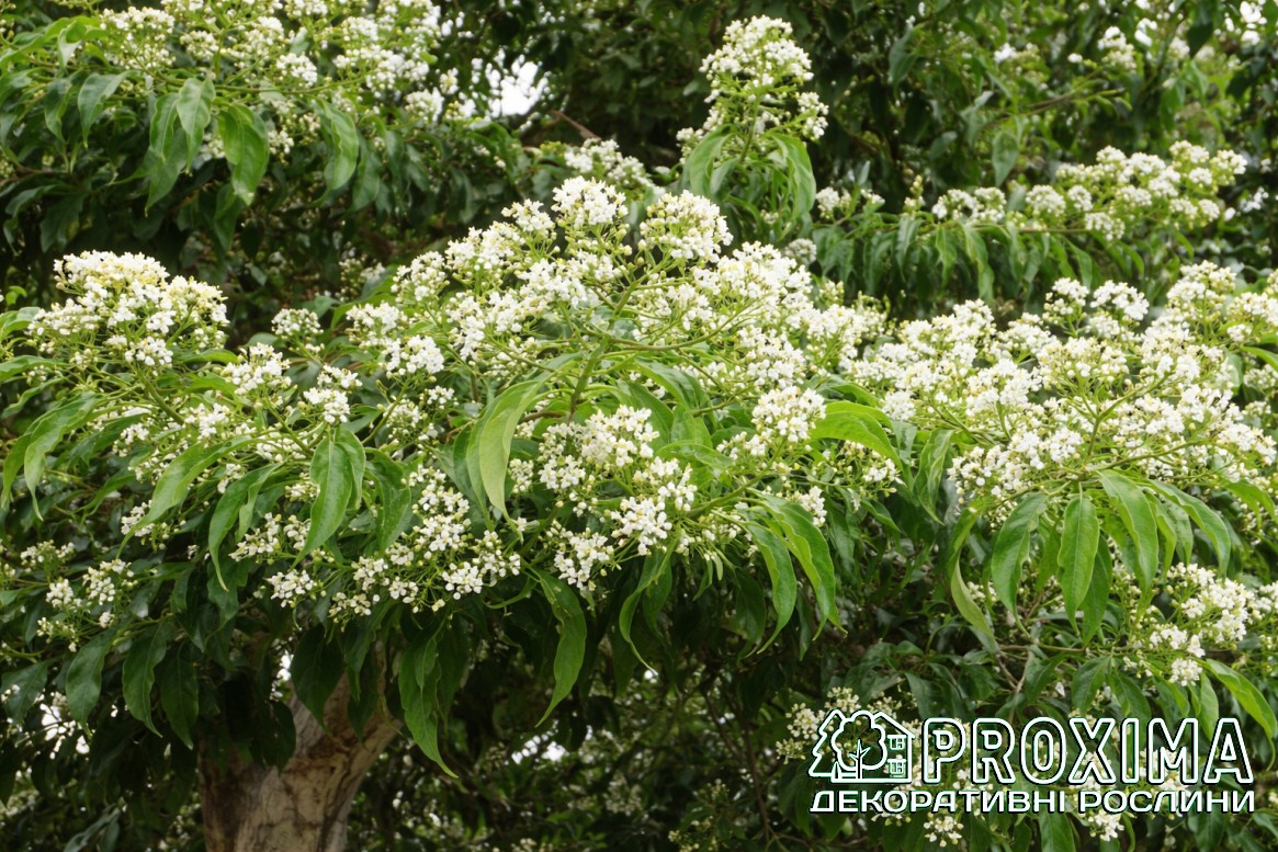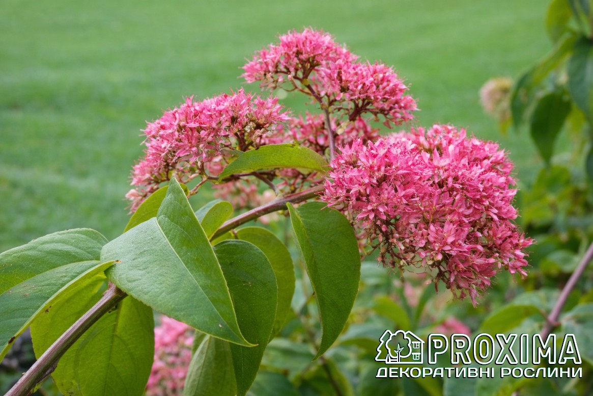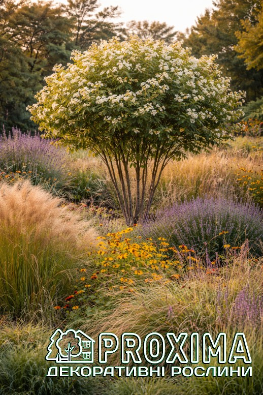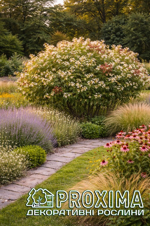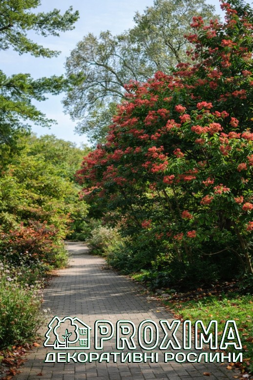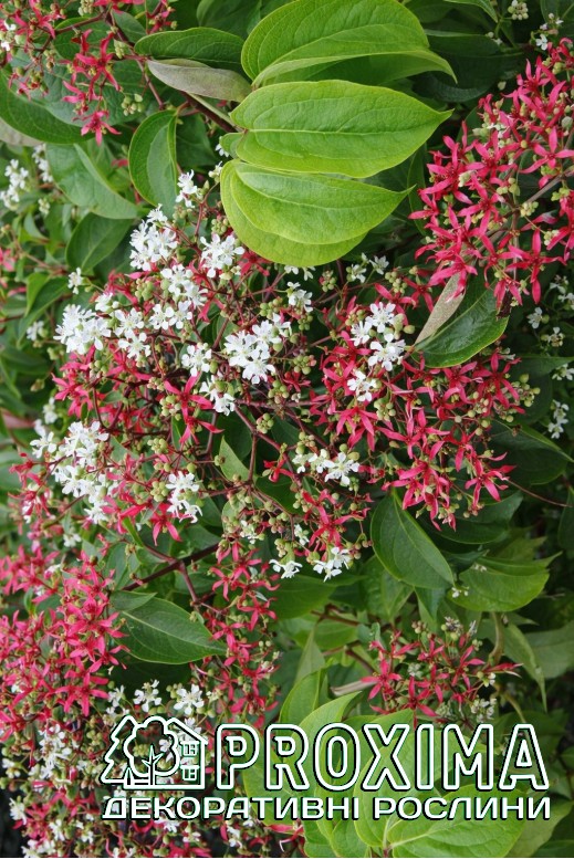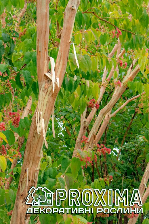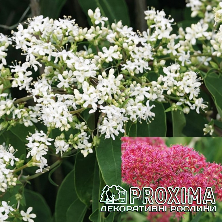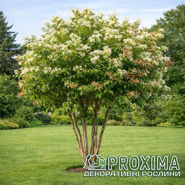 Опис сорту: Гептакодіум міконієвидний — це кущ або невелике дерево з характером і історією, що розкривається поступово, мов добре написана книга. Навесні прокидається спокійно й стримано, вкриваючись великим, темно-зеленим листям із виразними жилками. Влітку формує легку, напівпрозору крону, крізь яку м’яко просочується світло, створюючи в саду атмосферу тиші та рівноваги. Та справжня магія починається наприкінці літа. У серпні–вересні на кінцях пагонів з’являються кремово-білі запашні суцвіття, що збирають навколо себе бджіл і метеликів. Коли ж квіти опадають, декоративність не зникає — чашолистки поступово набувають насиченого рожево-червоного відтінку, і здається, ніби дерево зацвітає вдруге. Восени його силует стає ще виразнішим, а взимку на перший план виходить світла, лущена кора, що відкриває теплі коричневі шари під собою.