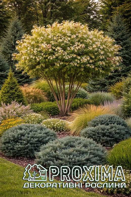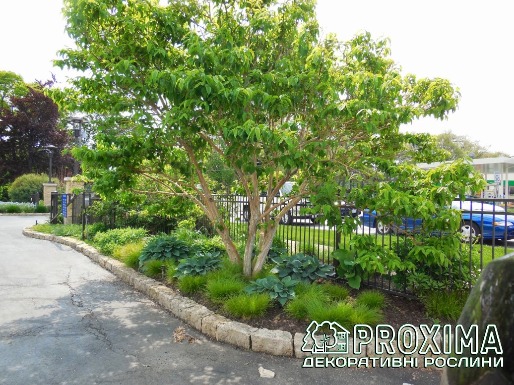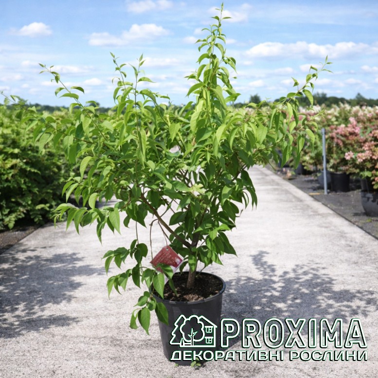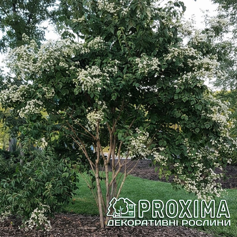 Використання в ландшафтному дизайні: Heptacodium miconioides — універсальне декоративне дерево або кущ, яке стане виразним акцентом у саду будь-якого стилю. Завдяки компактним розмірам, легкій напівпрозорій кроні та декоративності протягом усього року воно ідеально підходить для приватних ділянок, внутрішніх двориків і камерних просторів. Найчастіше гептакодіум висаджують як солітер на газоні — там він повністю розкриває свою красу: ароматне пізнє цвітіння, рожеві післяквіткові відтінки восени та ефектну світлу кору взимку. Біля терас і зон відпочинку дерево створює легку тінь і наповнює простір ніжним ароматом наприкінці літа. У природних та прерійних садах гармонійно поєднується зі злаками та багаторічниками, додаючи вертикальний ритм композиції. У сучасних мінімалістичних проєктах його використовують як архітектурний елемент — особливо ефектно виглядає з підсвіткою стовбура. На фоні темних вічнозелених рослин світла кора створює яскравий контраст у зимовий період.