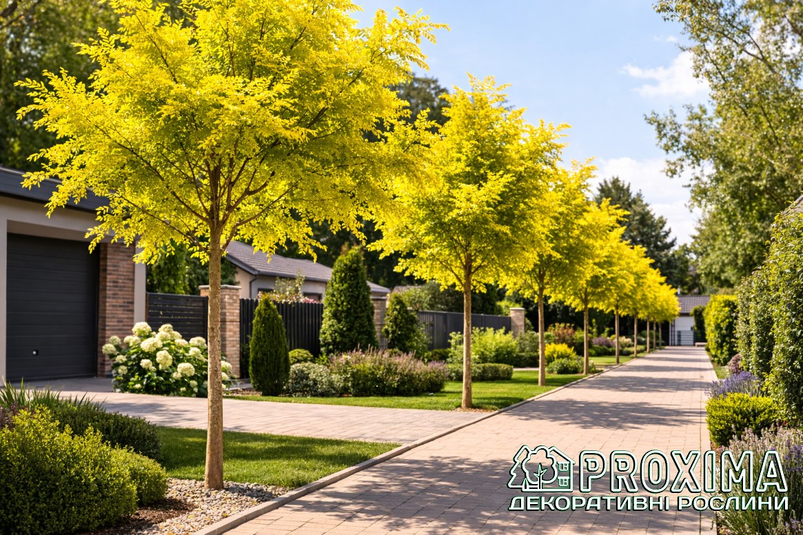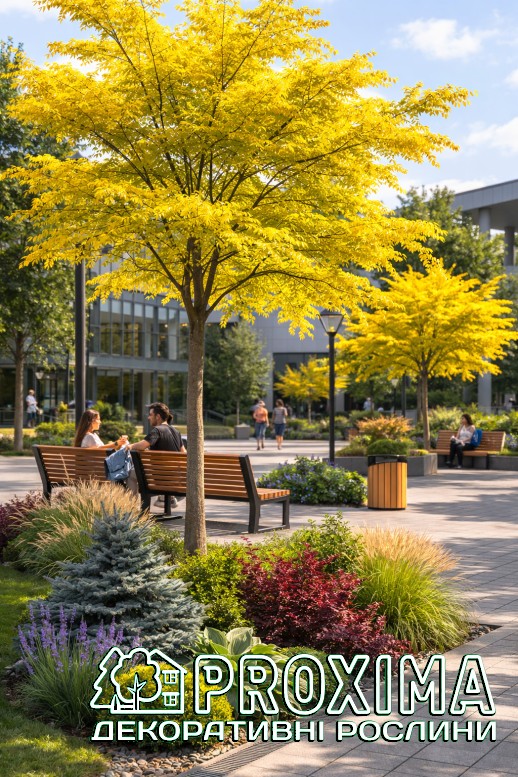 Використання в ландшафтному дизайні: Гледичія колюча Санберст — одне з найефектніших декоративних дерев для сучасних садів і міського озеленення. Завдяки ажурній кроні та яскравому золотистому листю воно створює виразний світловий акцент у композиціях і надає простору відчуття легкості. Найчастіше дерево використовують як солітер — центральний акцент на газоні або у відкритій частині саду. Навесні та на початку літа крона виглядає ніби освітленою зсередини, тому рослина чудово працює як фокусна точка в композиції. Гледичія добре підходить і для алейних посадок вздовж доріжок, під’їздів або садових алей. Завдяки легкій, мереживній кроні вона не створює щільної тіні, тому під деревами можна висаджувати декоративні багаторічники, злаки або низькі кущі. У сучасних і природних садах ‘Sunburst’ часто поєднують із рослинами темного або синьо-зеленого кольору — хвойними, барбарисами, деренами чи декоративними травами. Такий контраст підкреслює яскраве золотисте листя і робить композицію більш глибокою. Дерево також широко застосовується у міському озелененні: у парках, скверах, біля громадських будівель і на площах. Воно добре переносить міські умови, забруднене повітря та ущільнені ґрунти, а також не створює великої кількості сміття завдяки дрібному листю. Завдяки своїй легкій структурі крони гледичія створює м’яку розсіяну тінь, тому під нею комфортно облаштовувати зони відпочинку, тераси або лавки. У саду вона часто виконує роль природного «сонячного фільтра», додаючи простору світла, повітря та відчуття простору.