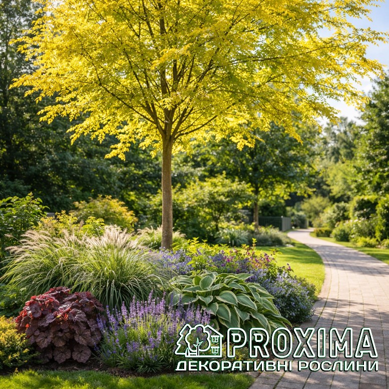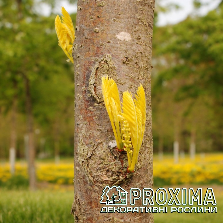 Опис сорту: Gleditsia triacanthos Sunburst — ефектне декоративне дерево, яке привертає увагу насамперед своїм сяючим золотистим листям. Навесні крона буквально спалахує світлом: молоде листя розгортається яскраво-жовтим, майже лимонним, створюючи в саду відчуття сонячного сяйва. З часом відтінок стає м’якшим і переходить у ніжний жовто-зелений, але дерево протягом усього сезону зберігає теплу, світлу гаму кольорів. Крона у цього сорту легка й ажурна. Дрібно розсічене листя пропускає багато світла, завдяки чому під деревом утворюється м’яка мереживна тінь. Така особливість робить рослину особливо цінною для садів, де важливо зберегти відчуття простору та світла. На відміну від дикої форми гледичії, ‘Sunburst’ майже не утворює колючок, тому виглядає значно охайніше й безпечніше для використання у приватних садах. Протягом сезону дерево постійно виглядає свіжим, адже на кінцях пагонів регулярно з’являється новий приріст із яскравим золотистим листям. Завдяки своїй світлій кольоровій гамі та легкій графічній кроні цей сорт створює виразний контраст із темними хвойними рослинами та насичено-зеленими деревами. У саду він працює як природний «промінь світла», який освіжає композиції й додає ландшафту динаміки та легкості.