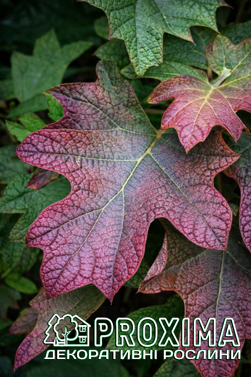 Листя: Ключовою особливістю гортензії ‘Alice’ є її винятково декоративне листя — справжня гордість цього сорту. Воно разюче нагадує листя дуба: велике, глибоко лопатеве, з 5–7 чітко окресленими частками та виразно зазубреними краями. Листові пластини вражають розмірами — часто до 20–30 см у довжину. Влітку листя насичено-темно-зелене, зверху гладке й свіже, а знизу трохи світліше, з легкою оксамитовою опушкою. Та справжня магія починається восени. Саме тоді ‘Alice’ демонструє свою головну фішку — розкішне осіннє перевтілення. Листя поступово змінює колір, перетворюючись на живий калейдоскоп теплих і глибоких відтінків: бронзових, мідних, бордових, насичено-пурпурових і вогняно-червоних. Це забарвлення не зникає миттєво — воно довго тримається на кущі, часто аж до перших серйозних морозів, створюючи потужний осінній акцент і роблячи ‘Alice’ справжньою королевою пізнього саду.