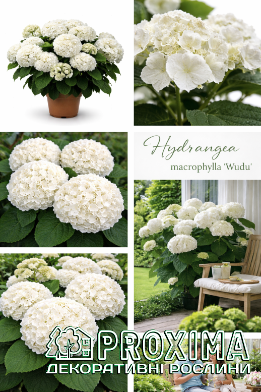 Використання в ландшафтному дизайні: Гортензія широколиста Вуду — це справжній білосніжний акцент у саду. Її великі, чисто-білі шапки квітів чудово виглядають як поодинокі кущі в контейнерах на терасі чи балконі, так і в групових посадках на клумбах. Вона створює елегантний контраст із темно-зеленим листям сусідніх рослин, підкреслює красу хвойників або яскравих багаторічників. У сучасному саду ‘Wudu’ стає частиною мінімалістичних композицій із каменями, декоративними доріжками або металевими елементами — її білі суцвіття роблять простір легким і повітряним. Кущі, висаджені в групах, утворюють білосніжні острови, що гармонійно розбавляють насичені кольори інших рослин і створюють відчуття спокою та гармонії. Цей сорт ідеально підходить для тих, хто хоче додати саду елегантності без зайвого клопоту — адже він довго тримає форму і залишається декоративним протягом усього сезону.