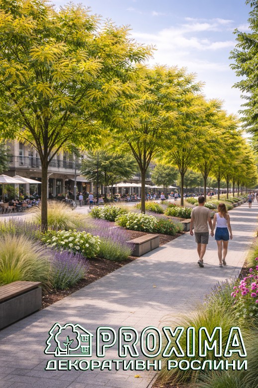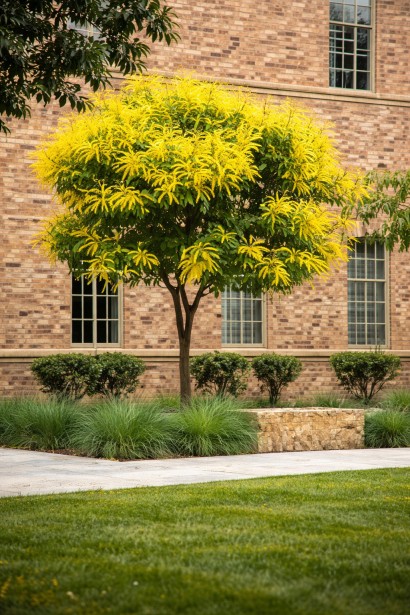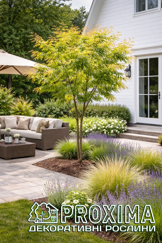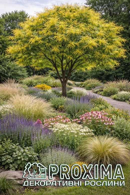 Використання в ландшафтному дизайні: Koelreuteria paniculata — ефектне декоративне дерево, яке легко стає виразним акцентом у садовому просторі. Його легка, ажурна крона створює відчуття повітряності, а яскраве літнє цвітіння додає композиціям тепла й світла. У середині літа дерево вкривається великими золотистими волотями квітів, які нагадують легкий «золотий дощ» і миттєво привертають увагу.