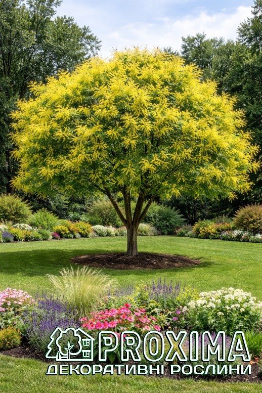 Опис сорту: Кельрейтерія волотиста — декоративне дерево, яке легко привертає увагу своєю легкою, майже повітряною кроною та яскравими літніми барвами. Воно створює в саду відчуття світла й руху, адже його велике ажурне листя м’яко коливається від найменшого подиху вітру, утворюючи ніжну мереживну тінь. Навесні дерево прокидається світло-зеленим листям, яке поступово стає насиченим і густим, надаючи кроні свіжого, соковитого вигляду. Справжнє перетворення відбувається в середині літа, коли на кінцях пагонів з’являються великі повітряні волоті яскраво-жовтих квітів. Вони піднімаються над листям, ніби золотиста хмара, і роблять дерево надзвичайно помітним у саду. Цвітіння виглядає легким і святковим, немов сонячний дощ, що тихо розсипається серед зелені. Після цвітіння декоративність рослини не зникає. На місці квітів формуються незвичайні плоди — тонкі паперові коробочки, схожі на маленькі ліхтарики. Спочатку вони мають світло-зелений колір, але поступово змінюються на ніжні рожево-бронзові або золотисті відтінки. Вони довго тримаються на гілках і створюють додатковий декоративний ефект, особливо наприкінці літа та восени. Завдяки поєднанню ажурного листя, яскравого цвітіння та оригінальних плодів Koelreuteria paniculata виглядає витончено й екзотично, але водночас залишається досить витривалим деревом. Воно добре переносить спеку, міські умови та короткочасну посуху, тому чудово підходить для озеленення приватних садів, дворів і міських просторів. У ландшафті це дерево часто використовують як солітер — яскравий живий акцент, що привертає погляд упродовж усього теплого сезону.