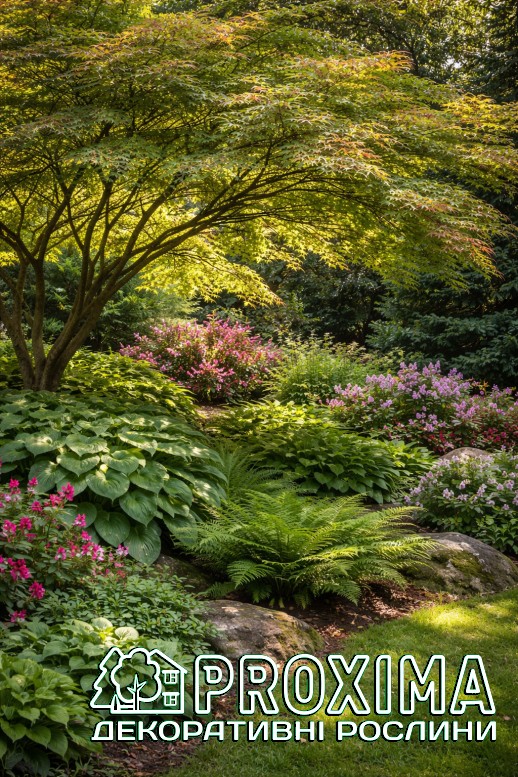 Завдяки ажурній кроні, що пропускає «плямисте» світло, під цим кленом ідеально почуваються хости, папороті, азалії та рододендрони.