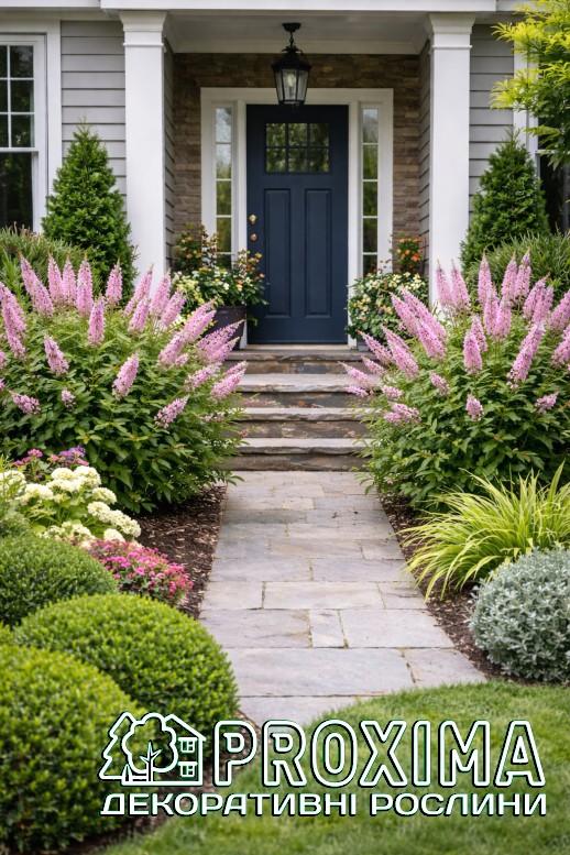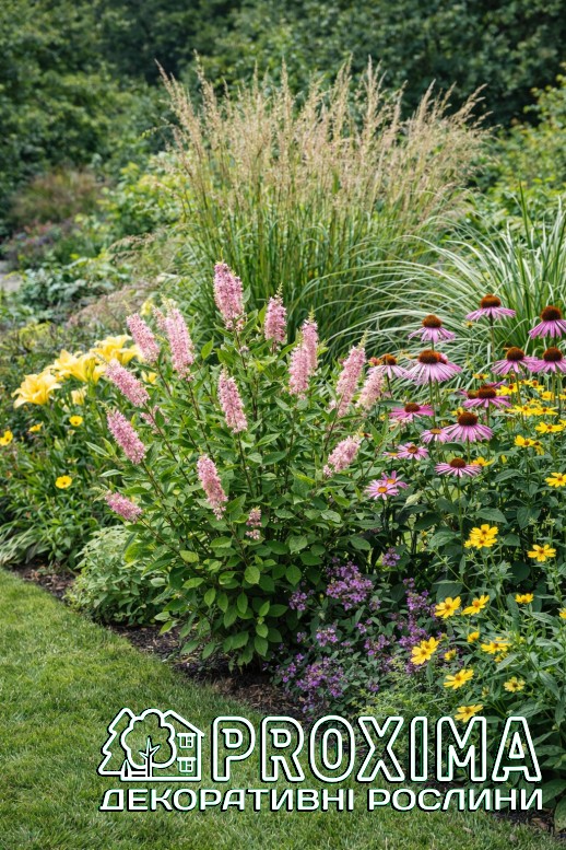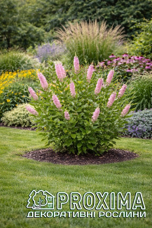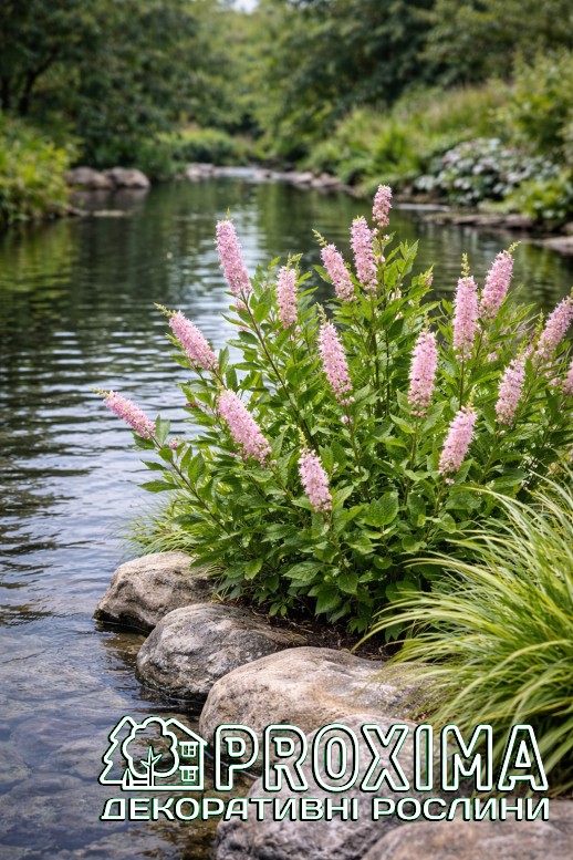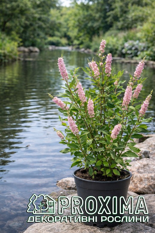 Використання в ландшафтному дизайні: Clethra Pink Spire — один із найцінніших літньоквітучих кущів для напівтіньових і вологих ділянок саду. Його використовують там, де потрібно поєднати декоративність, аромат і природну невибагливість. Завдяки вертикальним рожевим суцвіттям сорт чудово працює як акцент у міксбордерах природного стилю. Він додає композиції висоти та ритму, особливо в поєднанні з папоротями, хостами, астильбами та декоративними травами. У лісових і напівтінистих садах ‘Pink Spire’ виглядає органічно, ніби природний мешканець підліску. Рослина ідеально підходить для оформлення берегів водойм, дренажних канав або вологих низин, де багато інших кущів почуваються нестабільно. Також її висаджують групами для створення ароматних масивів біля терас, зон відпочинку чи садових доріжок — у період цвітіння повітря навколо куща наповнюється солодко-пряним ароматом. Завдяки компактній формі клетру можна використовувати як солітер у невеликих садах або як структурний елемент у багаторівневих посадках. Вона добре поєднується з рододендронами та іншими рослинами, що полюбляють кислий і вологий ґрунт. Окрема перевага — цвітіння в середині літа, коли більшість кущів уже відцвіли. Тому ‘Pink Spire’ часто застосовують для продовження декоративного сезону та підтримання інтересу до саду до самої осені.