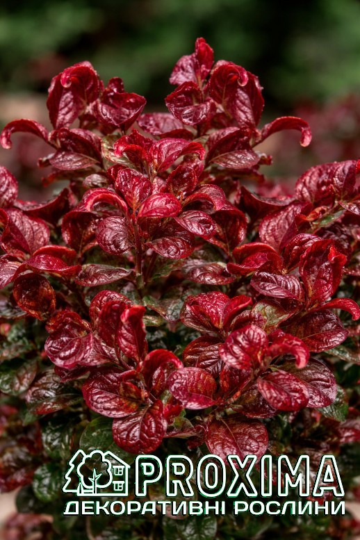 Листя: Листки не рівні, а химерно закручені всередину — ніби злегка стиснуті або «кучеряві». Вони невеликі, довгасто-яйцеподібні, завдовжки 3–6 см, густо розташовані на пагонах і щільно вкривають крону. Листова пластина товста, шкіряста, з інтенсивним глянцевим блиском, який зберігається протягом усього року. Молодий приріст з’являється яскраво-червоним або помаранчево-червоним і створює виразний контраст зі старішим листям. З часом воно переходить у насичений темно-зелений колір, не втрачаючи характерного «лакового» блиску. З настанням холодів рослина знову змінює забарвлення — листя набуває глибоких пурпурових, бордових або майже фіолетових відтінків. Чим нижча температура, тим інтенсивнішим стає червоний тон.