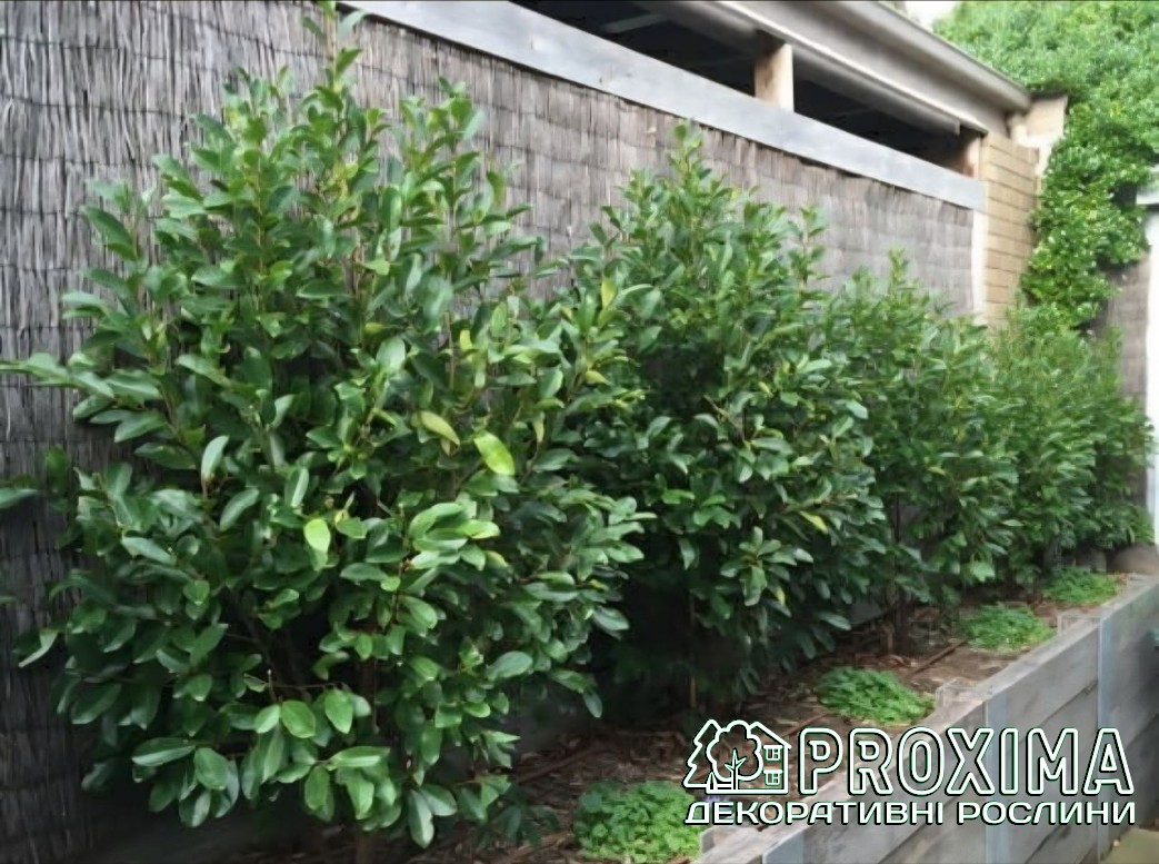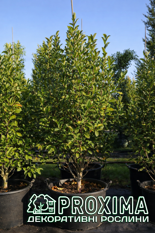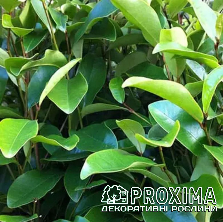 Листя: Листя вічнозелене, овальне або еліптичне, довжиною до 10 см. Листові пластини щільні, шкірясті та гладкі на дотик, з чітко вираженою центральною жилкою. Верхня сторона має насичений темно-зелений колір і привабливий глянцевий блиск, нижня — світліший або злегка сріблястий відтінок. Завдяки щільності та глянцю листя стійке до вітру та сонячного випромінювання, зберігає декоративність впродовж усього року і не опадає взимку, підтримуючи яскравий, насичений вигляд рослини навіть у холодний сезон.