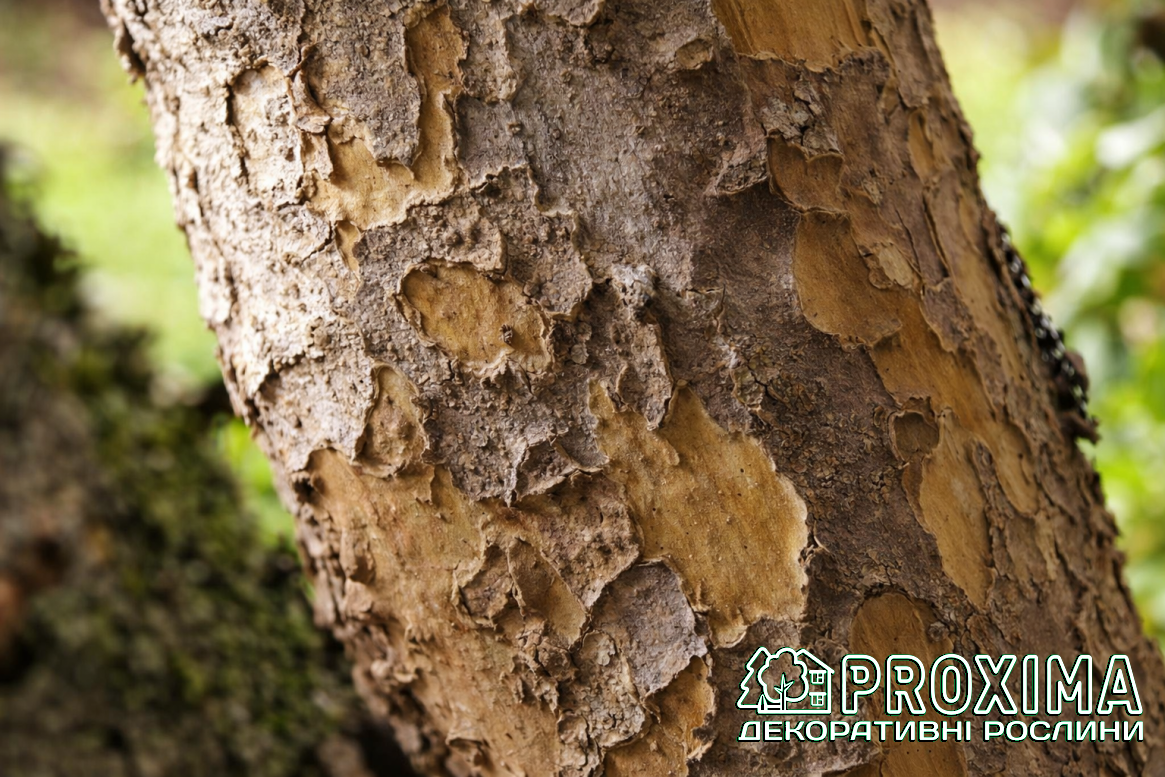 Кора: Кора не поступається у виразності ні листю, ні цвітінню — особливо взимку, коли дерево постає у всій своїй графічній красі. У молодому віці вона стримана й спокійна: гладка, сіро-коричнева або попелясто-сіра. Та з роками кора стає справжнім мистецьким полотном. Вона починає відшаровуватися великими, тонкими платівками, подібно до платана чи ліквідамбара, відкриваючи під собою живу мозаїку внутрішніх шарів. На стовбурі з’являються плями кремового, світло-зеленого, бежевого, сірого, ніжно-рожевого й навіть блідо-фіолетового відтінків. Узимку, на тлі холодного неба та снігу, ця кора виглядає як природна абстрактна картина — стримана, глибока й надзвичайно шляхетна.