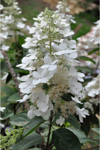 Цветки: Собраны в большие, пышные, широко конусовидные соцветия-метелки длиной около 30см, меняющие свой окрас от сливочно-белого до снежно-белого. В конце лета розовеют.