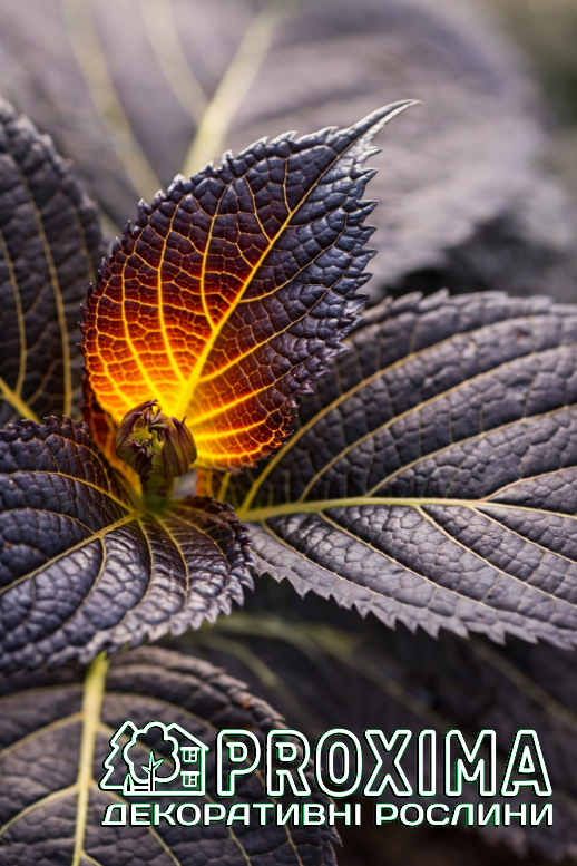 Листья: Листья Eclipse® — настоящая «изюминка» сорта. Их чрезвычайно декоративный темно-фиолетовый, почти черный цвет остается насыщенным в течение всего сезона. Крупные глянцевые листья имеют заостренную яйцевидную форму и выразительные жилки, что делает их ярким декоративным акцентом в саду. Осенью листья проходят удивительную трансформацию: темно-пурпурные оттенки становятся еще глубже, приобретая насыщенные бордовые или почти угольно-черные тона, придавая растению драматический шарм.