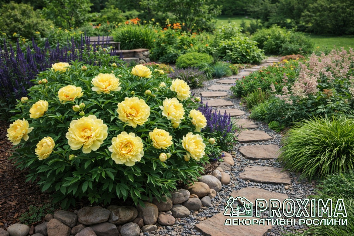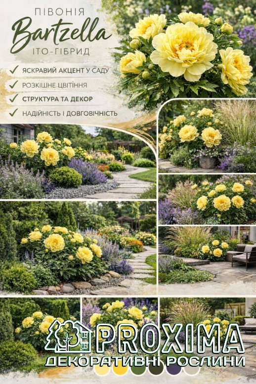 Использование в ландшафтном дизайне: Пион Ито-гибрид Бартзелла — один из самых эффектных пионов для сада, сочетающий в себе роскошь древовидных пионов и выносливость травянистых. Ее крупные лимонно-желтые цветы создают ощущение солнечного света среди зелени, поэтому в ландшафте она часто становится настоящим акцентом композиции.