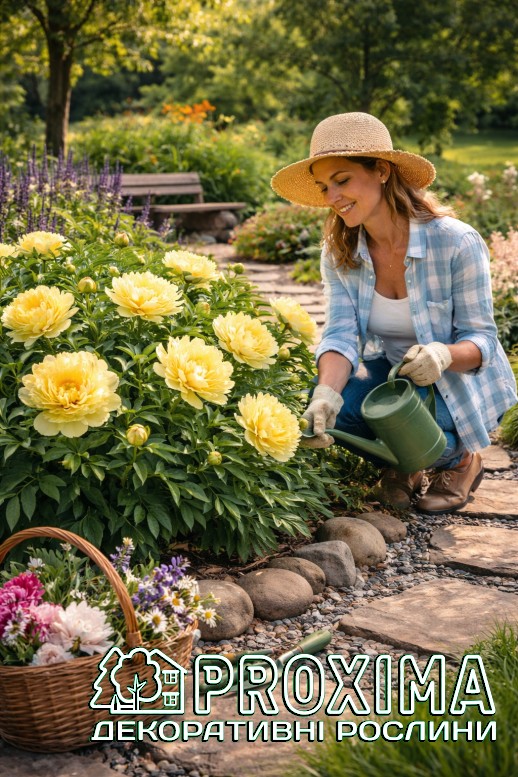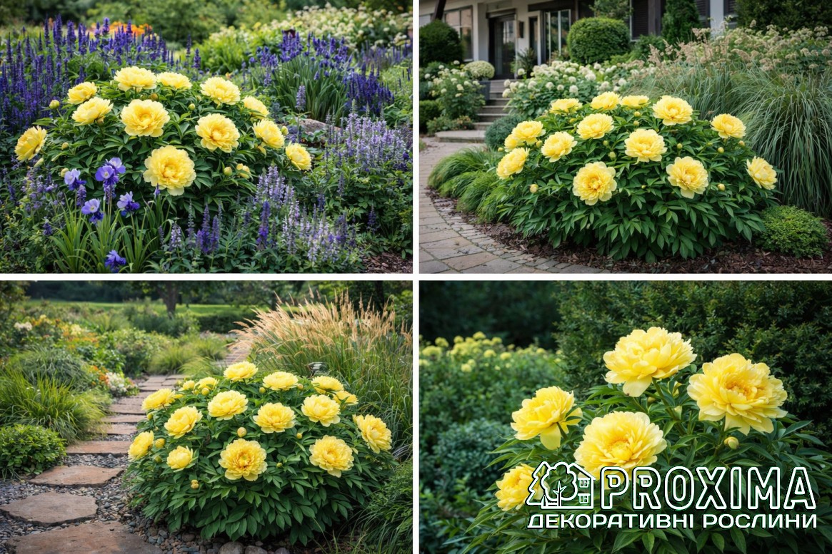 В парадных зонах сада — возле террас, дорожек или входа в дом — эта пион выглядит особенно торжественно. Посаженная небольшими группами по 3–5 растений, она образует роскошные цветущие «островки», которые привлекают внимание с большого расстояния. Также прекрасно вписывается в природные или романтические сады. Ее нежный желтый оттенок гармонично сочетается с декоративными злаками, например мискантусами или пеннисетумами, создавая ощущение легкости и естественности.