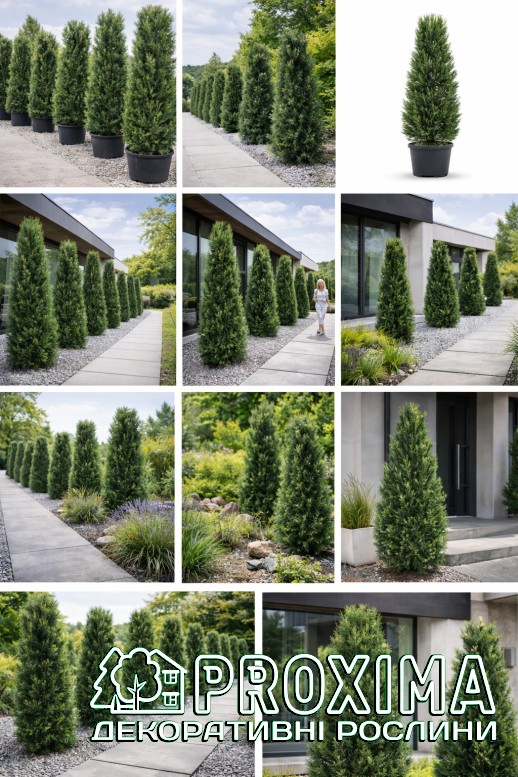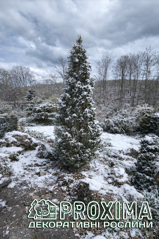 Форма: Крона вузькоколоноподібна або струнко-конічна, чітка й симетрична. Рослина формує щільний, монолітний силует із виразною вертикаллю, який зберігається протягом усього життя без потреби формування.