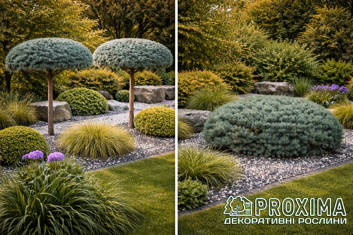 Особливо виграшно виглядає у композиціях із контрастом фактур: грубий камінь, м`який мох і щільна хвоя `Kinpo` створюють глибину, яка змінюється з кожним сезоном.
