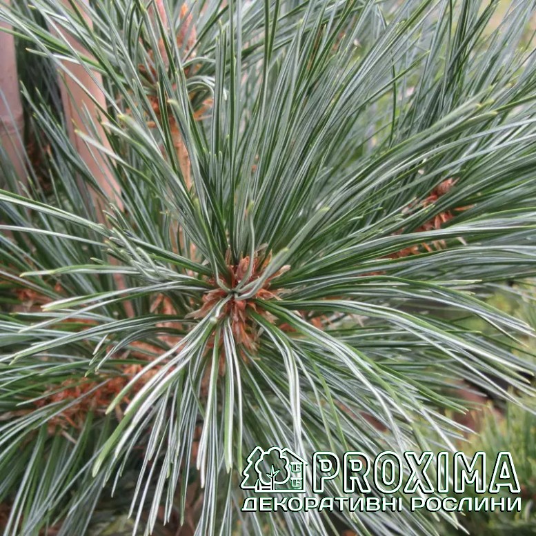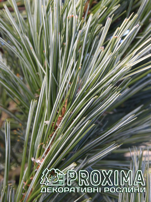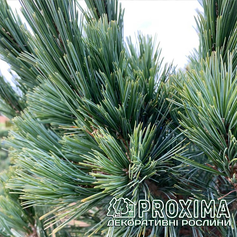 Хвоя: Головною особливістю сорту є довга (6–9 см), надзвичайно м’яка та гнучка хвоя, яка зібрана в густі пучки по 5 штук. Кожна хвоїнка має два кольори: темно-зелений із зовнішнього боку та яскравий сріблясто-блакитний із внутрішнього. Коли вітер торкається крони, дерево ніби «переливається» сріблом. На відміну від колючих ялин, до цієї сосни хочеться торкатися — вона створює ефект «пухнастої хмари». Хвоя тримається на гілках 3–4 роки, що забезпечує сорті щільну, «набиту» крону від самої землі до верхівки.