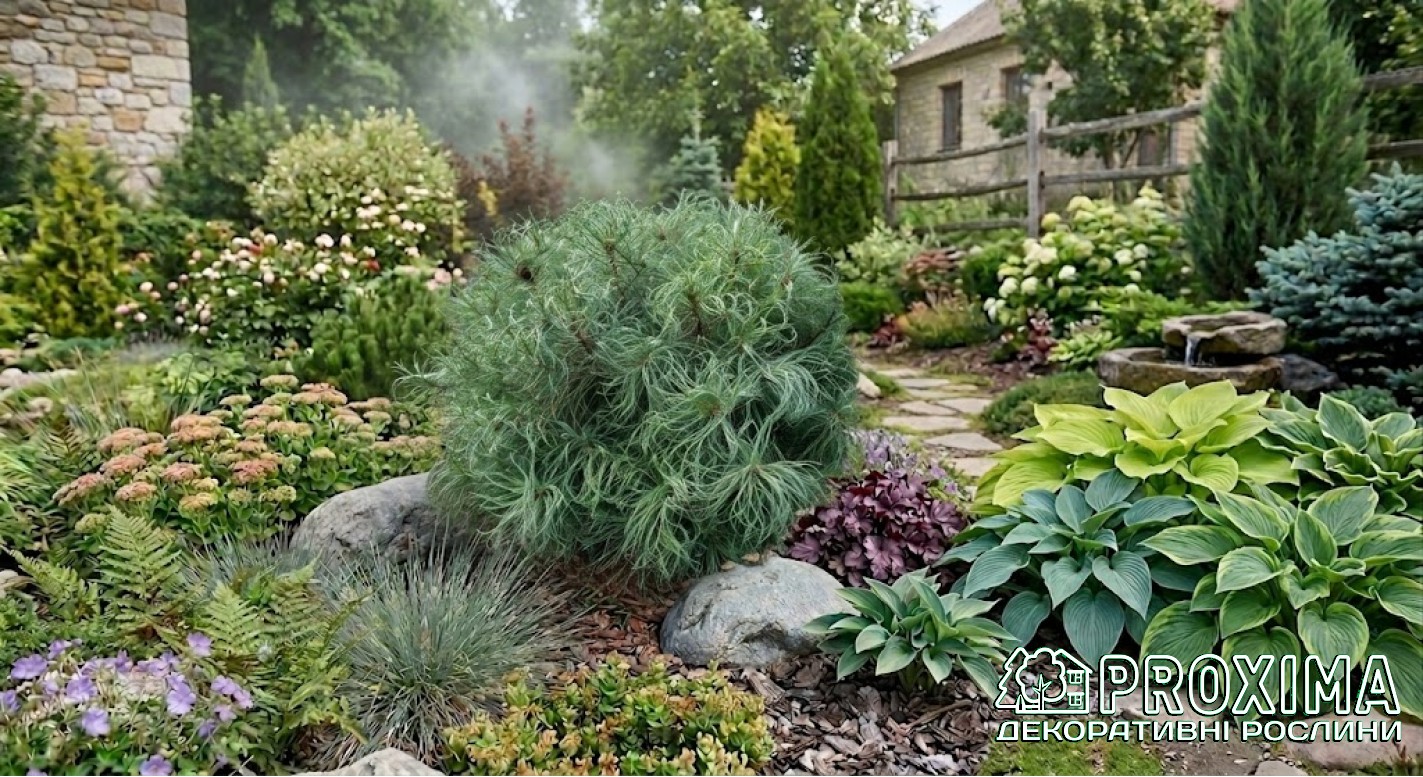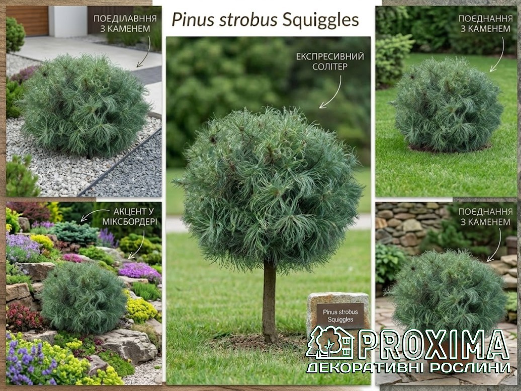 Використання в ландшафтному дизайні: Сосна веймутова Сквіглс — це ідеальний акцент для тих композицій, де хочеться відійти від класики і додати трохи живої, природної експресії. Його химерно закручені пагони працюють як скульптурний елемент — рослина виглядає ефектно навіть без додаткового оточення.
