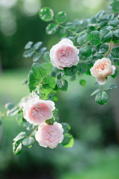 Квіти: Біло-персикові, ніжні, класичної келихоподібної форми на початку розкриття, згодом переходять у правильну розетку. Діаметр 7–9 см. Пелюстки щільні, злегка хвилясті. Квіти зібрані у невеликі суцвіття або поодинокі.