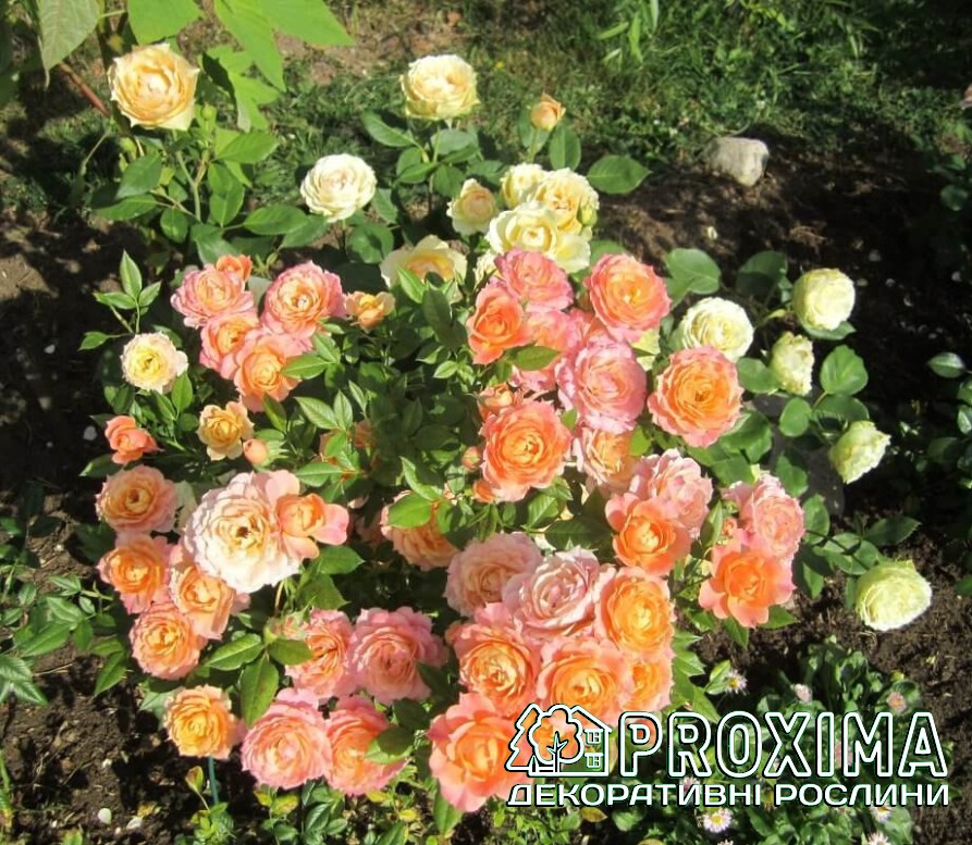 Опис сорту: Яскрава флорібунда з рясним цвітінням, яке прикрашає сад від початку літа до осені. Квіти поєднують теплі відтінки – від золотисто-жовтого до м’якого персикового з помаранчевим тоном у центрі. Кущ компактний, густий, з гарною облистненістю.