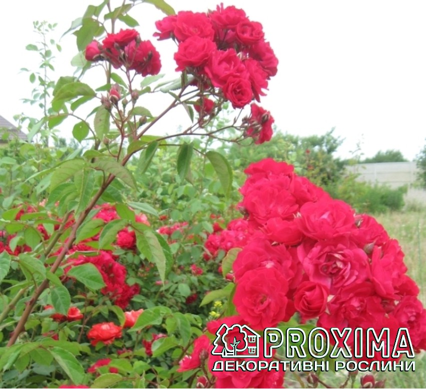 Квіти: Насичено-червоні, напівмахрові, діаметром 5–7 см, зібрані у великі кисті по 10–20 квіток. Витримують дощ, не втрачаючи декоративності.