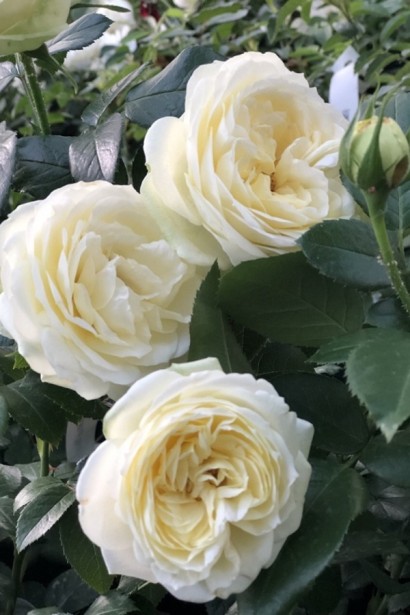 Квіти: Квітка дуже велика, густо махрова (понад 80 пелюсток), куляста у формі, діаметром 10–12 см. Відкривається повільно, з гарно оформленим центром у вигляді розетки. Колір – ніжно-кремовий, іноді з легким рожевим або перлинним відтінком, особливо по краях пелюсток. Тримається на кущі дуже довго (до 10 днів), не втрачаючи декоративності.