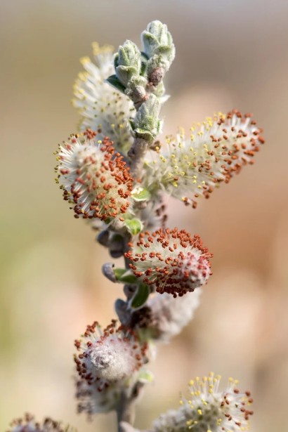 Квіти: Верба білувата Айсберг Еллі квітне однією з перших у саду, створюючи яскравий весняний акцент. Великі, пухнасті сріблясті «котики» (сережки). На початку цвітіння вони мають сріблястий колір, але згодом на них з’являються яскраві червоні або малинові пиляки. Цей контраст срібла та червоного на голих гілках виглядає надзвичайно ефектно. Цвітіння починається ранньою весною (березень–квітень), ще до появи першого листя. Оскільки квіти з’являються на пагонах минулого року, якщо ви плануєте формуючу обрізку, проводьте її після того, як «котики» відцвітуть.