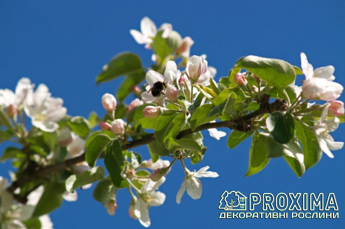 Добриво / захист: висаджені дерева потребують мінеральних добрив. Спочатку азот вноситься в середині травня, вдруге – у середині червня. Це благотворно впливає формування крони рахунок сильних осінніх приростів. Якщо молоде дерево в перший рік росте дуже швидко, то наступного року азотне добриво використовуємо тільки на початку травня. Наступні два роки, щоб не нашкодити утворенню плодів, добрива азотом мінімізуємо. Мульчування за допомогою перегною чи компосту позитивно впливає на розвиток дерев. Щоб захистити дерево від різних хвороб та шкідників, важливо правильно використовувати хімічні препарати в залежності від стадії розвитку. Під час розпускання бруньок слід використовувати бакові суміші фунгіцидів + інсектицидів: Актара, Енжіо + Хорус. У фазі розпускання бутонів – Хорус + Енжіо. Під час опадання листя застосовують Енжіо або Актеллік + Хорус. У період зростання плоду - Актеллік + Хорус. Обробка здійснюється через 10-12 днів після попередньої. Після збирання врожаю застосовують Хорус. У жовтні-листопаді обкопують пристовбурні кола, закопують або спалюють опале листя, а також вносять добрива. Усі вищезгадані препарати можна поєднувати без обмежень та без ризику зниження ефективності. Необхідна кількість робочого розчину для молодого дерева – 1л, дерева середнього віку – 2-3 л, дерева з великою кроною – понад 3 л. У нашому інтернет-магазині всі представлені сорти яблуні вирощені в Україні, тому вони стійкі до морозів і не потребують укриття на зиму. Але слід захистити кору дерева від зайців на висоту 120см. Якщо Ви купили імпортні саджанці плодових дерев з Європи 6-9 зони, то їх обов'язково потрібно вкрити на зиму. Для цього навколо кореневої шийки формуємо невеликий горбок із землі або мульчі, який убереже шийку та місце щеплення від обмерзання. Весною дерево слід розкрити. Всі рослини з розсадника Проксіма забезпечені добривами найкращої європейської якості пролонгованої дії. Купуючи рослини в контейнері, Ви можете висаджувати їх без додаткових добрив з березня по грудень – навіть у літню спеку.